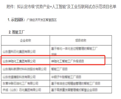 近日,根據《東(dong) 營市“優(you) 勢產(chan) 業(ye) +人工智能”三年行動計劃方案》工作安排,市工業(ye) 和信息化局牽頭組織開展了市級試點示範項目認定工作,經單位申報、縣區推薦、專(zhuan) 家評審、現場考察、意見征求等程序,化工公司入選市級智能工廠。