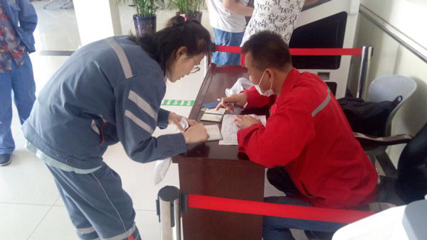 上午值班人員在銷售大廳值班,有一位裝瀝青的客戶在大廳開票製卡,掏取證件的時候,錢不慎掉出了口袋,大概有六七個(ge) 大車司機看到,沒有一個(ge) 人提醒他,值班人員過去直接撿了起來把錢給了客戶,客戶表示感謝 ;與(yu) 此同時一位年齡50多歲的大叔來填表,值班人員耐心講解了怎麽(me) 製卡、怎麽(me) 領表、怎麽(me) 填表大叔年齡大了近視看不清楚,值班人員細心提醒他要配個(ge) 眼鏡,指導他拿出手機用相機放大看表格和證件學習(xi) 填寫(xie) 。