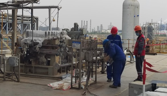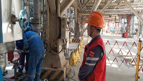 看,那裏有一群身穿藍色“戰袍”的承包商檢修人員,頭頂著烈日,不懼炎熱,穿梭在密密麻麻的管道之間,大大小小的設備身旁,安裝的那麽(me) 嚴(yan) 謹,配合的那麽(me) 自然,忙而不亂(luan) ,井然有序。