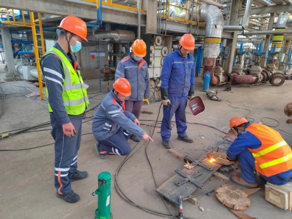 近一個(ge) 月來,高強度檢修工作任務和複雜多變的檢修現場,既驗證了團隊成員的鋼鐵意誌,也考驗了團隊解決(jue) 複雜問題的能力。以尾氣爐燃燒器更換為(wei) 例,初期的檢修方案僅(jin) 僅(jin) 是拆舊裝新,但在拆除過程中卻遇到了困難——由於(yu) 設備長期運行導致燃燒器內(nei) 部保護風線堵塞,燃燒器內(nei) 部出現大量硫磺,硫磺冷卻後將燃燒器分布器管和爐體(ti) 的空隙填滿,導致燃燒器拆除難度倍增,由於(yu) 固體(ti) 硫磺的存在達不到特殊作業(ye) 標準,拆除作業(ye) 被迫暫停。後經檢修團隊深入研討論證,嚐試采用蒸汽保護,先在燃燒器底部開孔,將硫磺清理幹淨後再對舊燃燒器進行分解拆除,最終順利完成了燃燒器的更換,在此刻,團隊的力量得到了最好的印證。