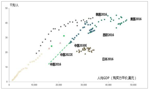 主要國家和地區人均聚乙烯消費量和人均GDP關(guan) 係