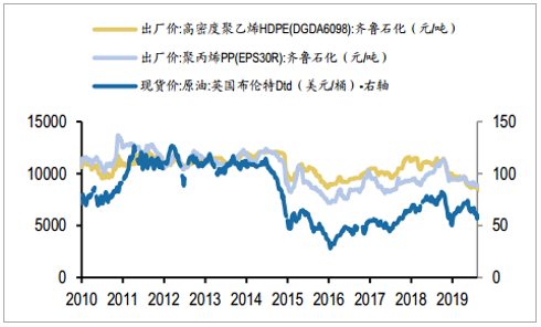 2019年以來由於(yu) 美國原油產(chan) 量持續增長,主要石油消費國經濟增速放緩等原因,原油市場的不確定性有所加大,美國能源信息署(EIA)認為(wei) 全球原油到2020年將保持供大於(yu) 求的局麵,預測2019年布倫(lun) 特原油價(jia) 格平均將為(wei) 61美元/桶, 2020年將小幅升至62美元/桶,而目前聚乙烯和聚丙烯價(jia) 格已基本回落至2009年以來的最低水平,預計中長期聚烯烴價(jia) 格跟隨原油價(jia) 格波動,有望延續中高位運行。